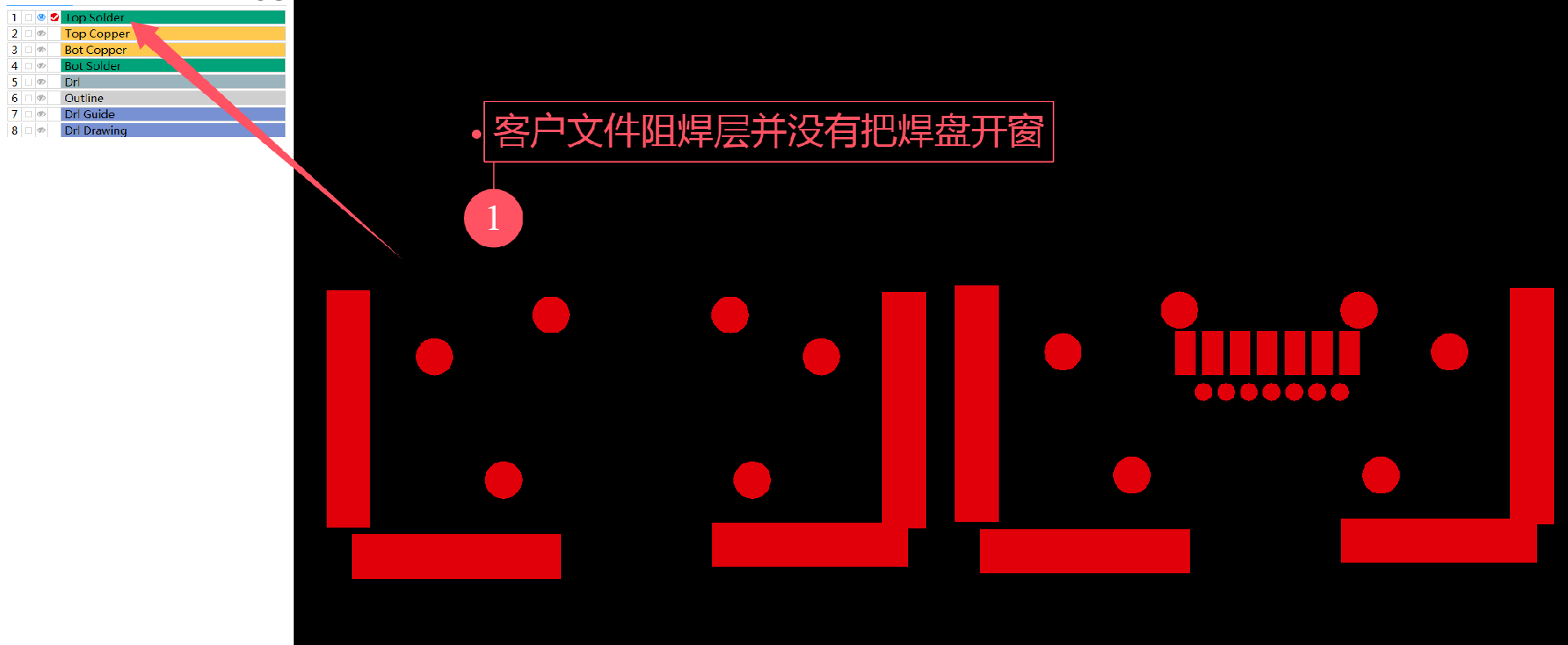 文件明顯的出現了錯誤,錯誤原因是阻焊層是蓋油的最終成品按文件應該是